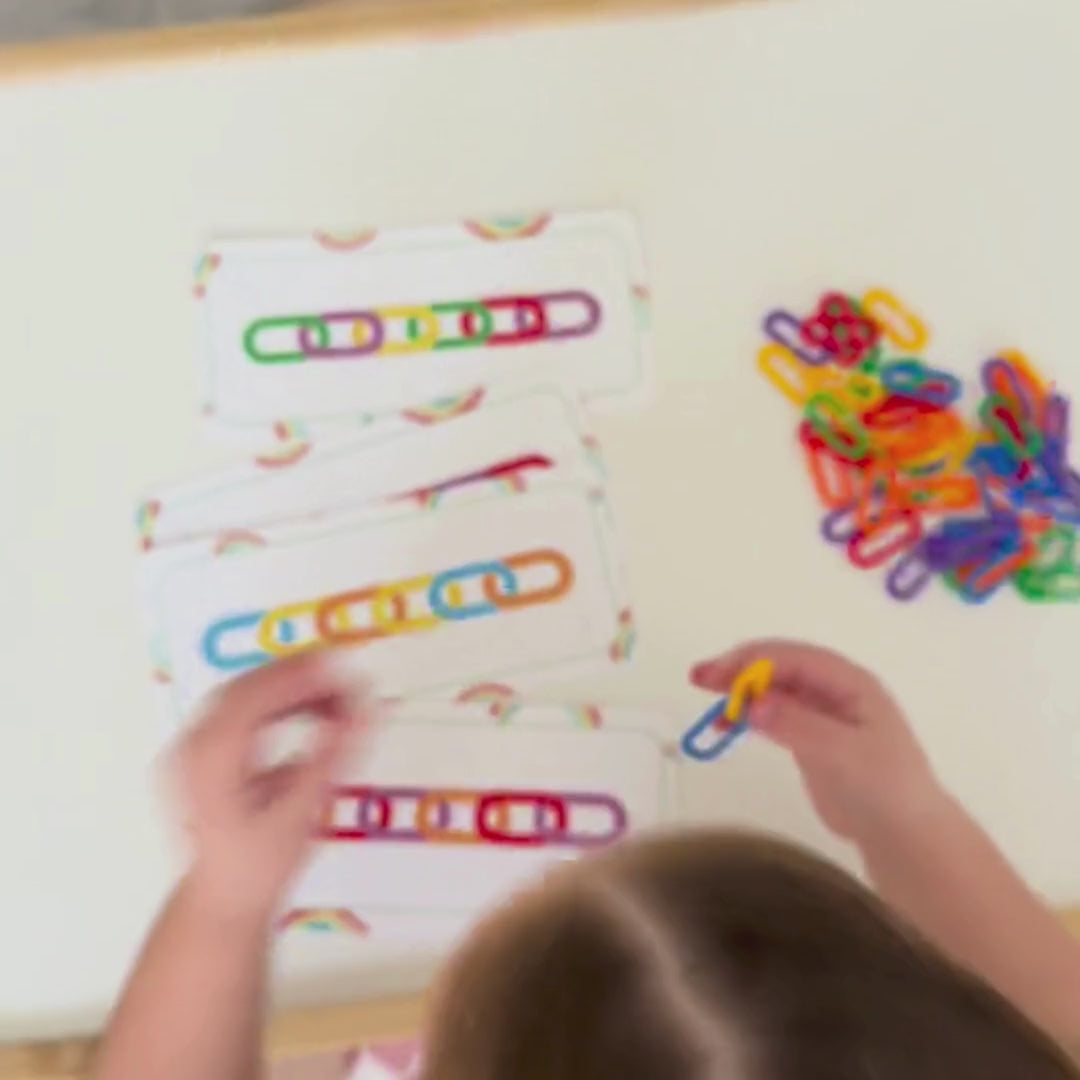 Children link, sort, and match the colourful chains to recreate the designs shown on the pattern cards. With every link clicked into place, they’re building focus, confidence, and independence.
