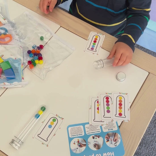 Little ones simply choose a pattern card and drop the pom poms into the clear test tubes to recreate the design. This calm activity encourages focus, concentration, and problem-solving, while giving children the joy of completing each challenge.